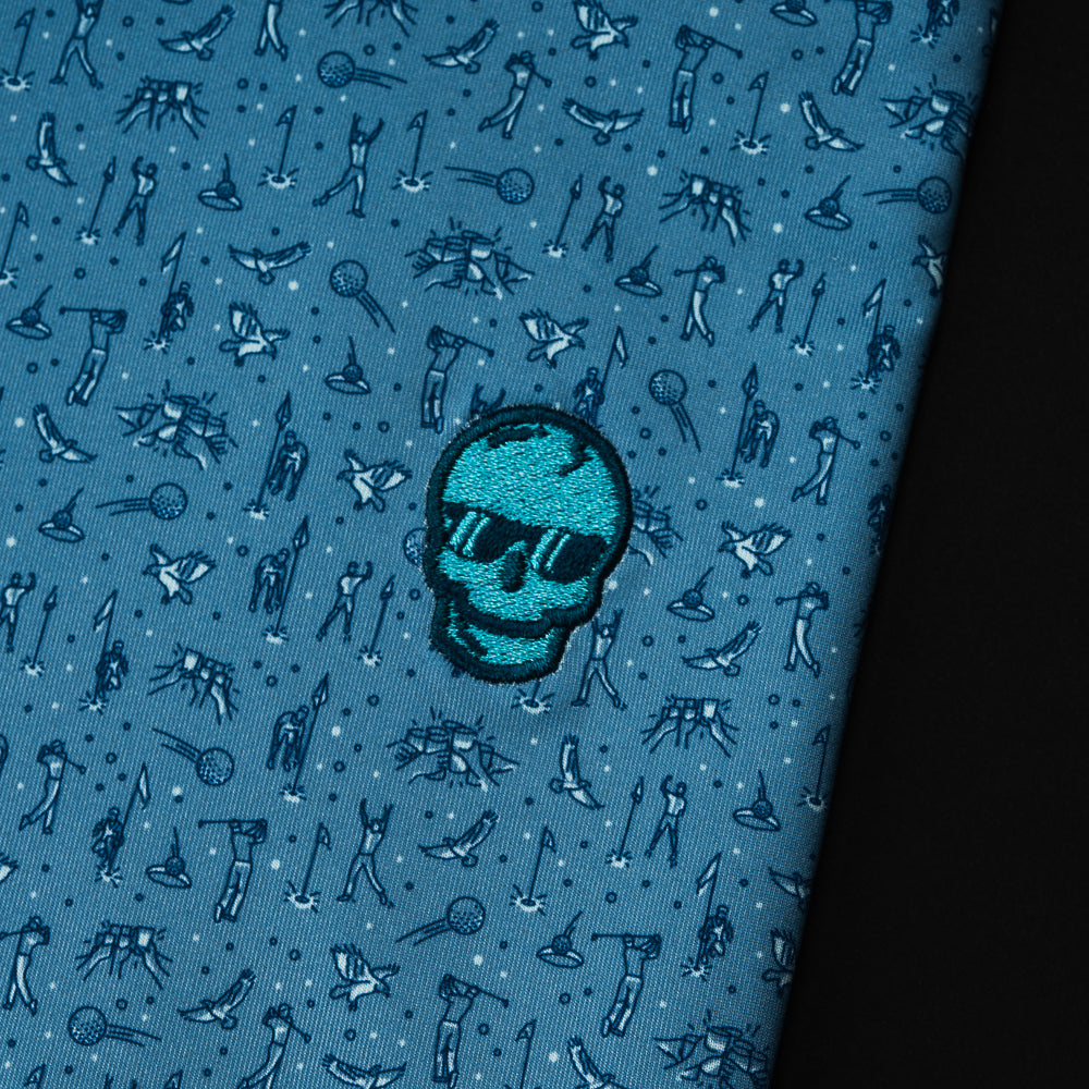 This Peter Millar polo features a golf course themed print and an embroidered skull on the left chest. It has all the practical benefits of performance wear that perfectly transitions off the course. It is constructed from an innovative poly-blend jersey, offering a moisture-wicking surface, four-way stretch, odor control and easy-care.