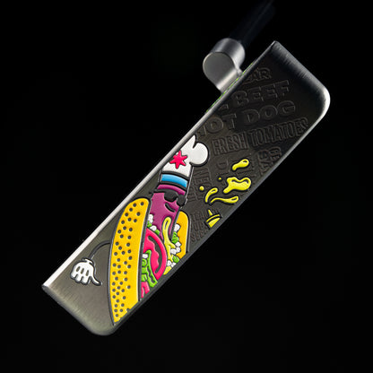 Well, isn't this a handsome treat? A putter that's not just a feast for the eyes but can actually, you know, putt! This putter showcases a vibrant depiction of a classic Chicago style hot dog, complete with all the traditional toppings - neon green relish, sport peppers, a dill pickle spear, tomatoes, onions, yellow mustard, and a dash of celery salt, all nestled in a poppy seed bun. So, why not add some flavor to your golf gear with this tasty treat?