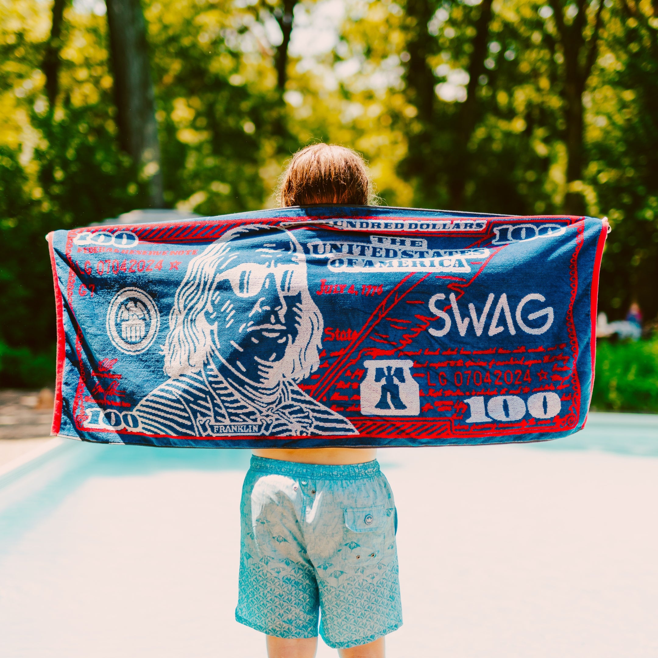 This patriotic beach towel is more than just a stylish accessory - it's a statement piece celebrating American pride. Wrap yourself in the soft, absorbent cotton and feel a sense of confidence and sophistication as you soak up the sun. Whether you're lounging poolside or strolling the shore, the RWB Franklin Beach Towel will make you the envy of the beach.