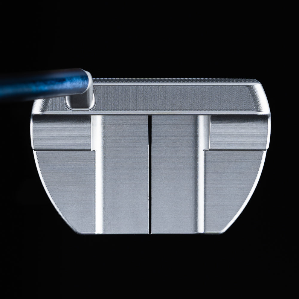 Unlike other mallet putters in the market today, this project made us think outside the box to figure out how to properly machine this style neck all in one piece without bending and polishing the neck or topline. Engineering the one-piece milled small slant neck that gives an unimpeded view of the ball from address was one of the most important aspects of this design. At nearly one shaft of offset, this configuration encourages toe flow in a low profile solid milled stainless mallet.