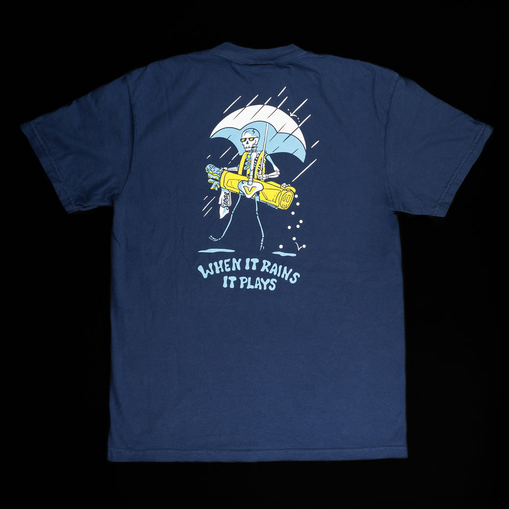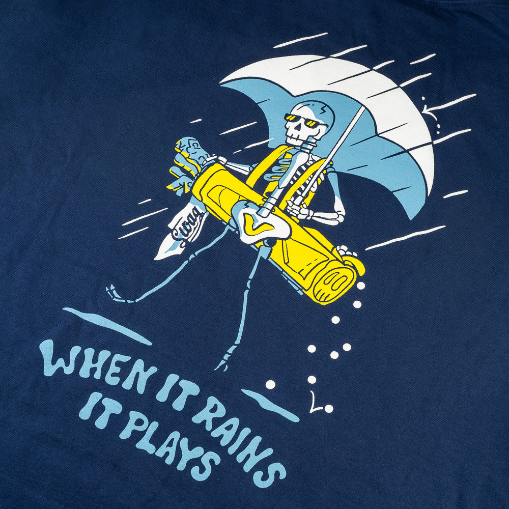 Introducing the When It Rains T-shirt – because apparently, golf in the rain is everyone's idea of a good time. Crafted from garment-dyed navy cotton, this shirt boldly says, "Bring on the puddles and soggy greens" while you proudly flaunt your love for wet fairways and wet socks.