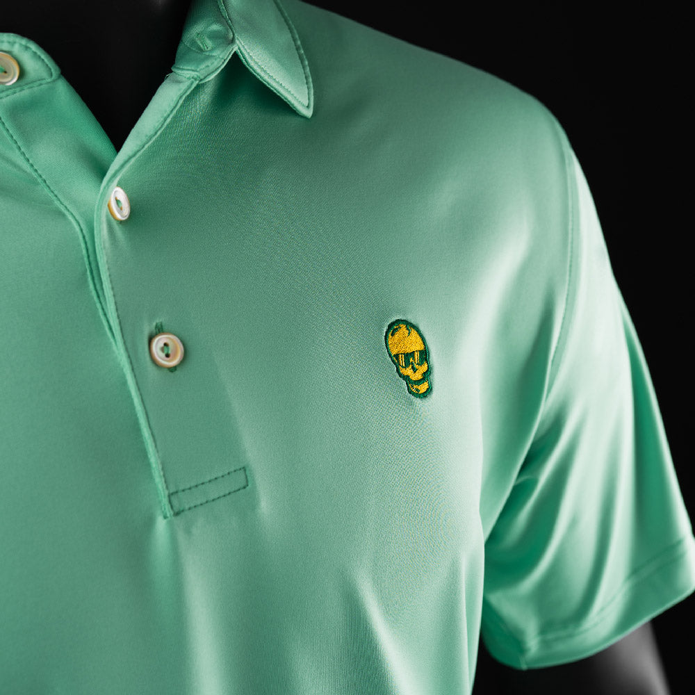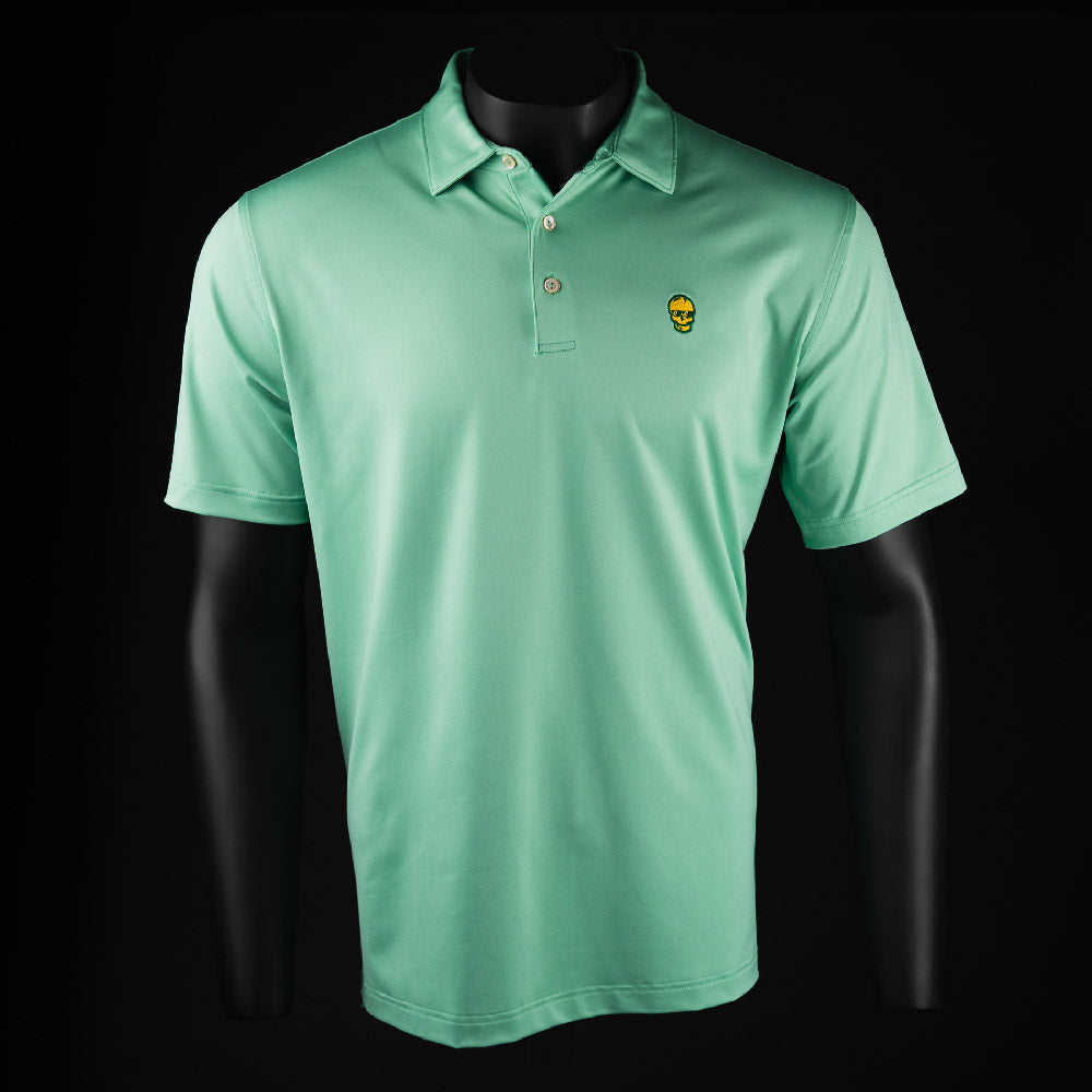 This Peter Millar polo features the iconic Swag skull and SWAG on sleeve in a green and yellow colorway perfect for this week's tournament. It has all the practical benefits of performance wear, with a unique print that perfectly transitions off the course. It is constructed from an innovative poly-blend jersey, offering a moisture-wicking surface, four-way stretch, odor control and easy-care.