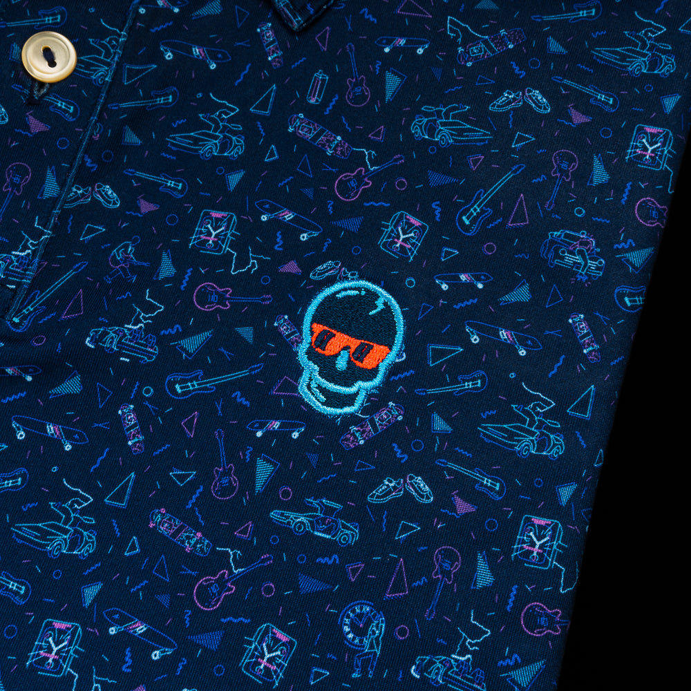 This Peter Millar youth polo features a Back to the Future-inspired print and an embroidered blue skull on the left chest. It has all the practical benefits of performance wear that perfectly transitions off the course. It is constructed from an innovative poly-blend jersey, offering a moisture-wicking surface, four-way stretch, odor control, and easy-care.