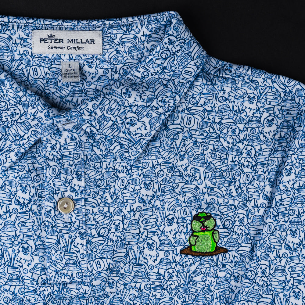 Peter Millar's classic youth polo is made from a soft, easy-care jersey performance fabric that offers moisture-wicking, four-way stretch, and odor control for optimal comfort and mobility. UPF 50+ sun protection offers additional protection from the elements. It's designed with a unique novelty pattern for added style. It's finished with a Sean self-fabric collar and two-button placket. Featuring a Caddyshack inspired neon green gopher with sunglasses and SWAG text on the sleeve.